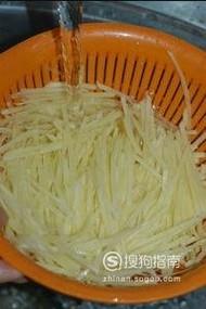把土豆丝洗好后,捞出来,先把锅里加上水,把水烧开后倒入土豆丝进去煮,四百分钟捞出来,用冷水冲洗一遍!