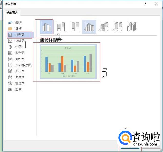选择要插入的图表,这里以插入柱状图为例,点击柱状图,选择左边第一个图,然后可以看到簇状柱形图效果,最后点击确定。