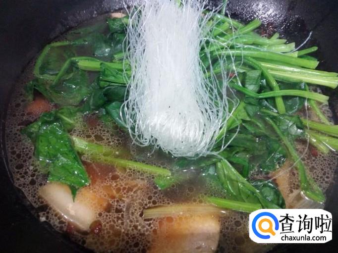 煮至4~5分钟的时间,五花肉煮熟后,放入菠菜,粉丝,转大火烧开。开锅后,放入味精,关火即可。