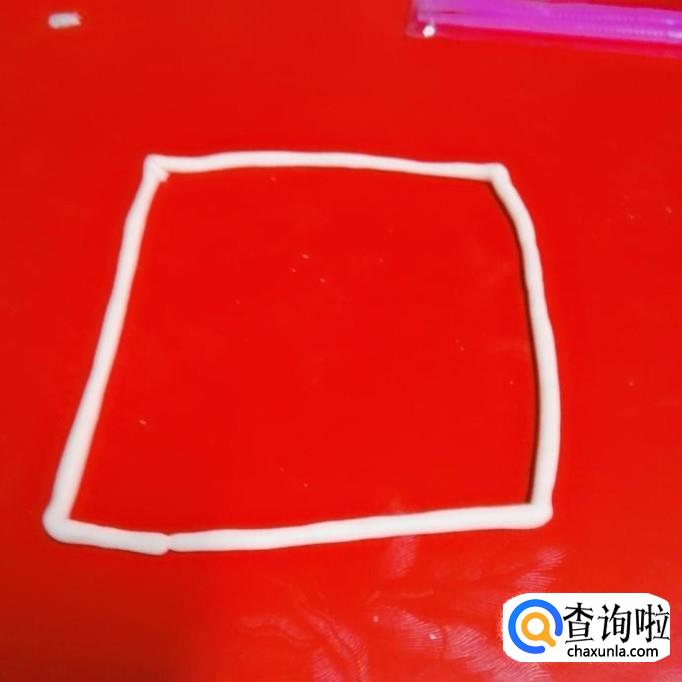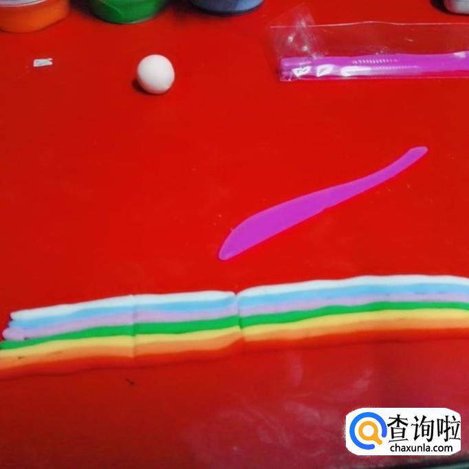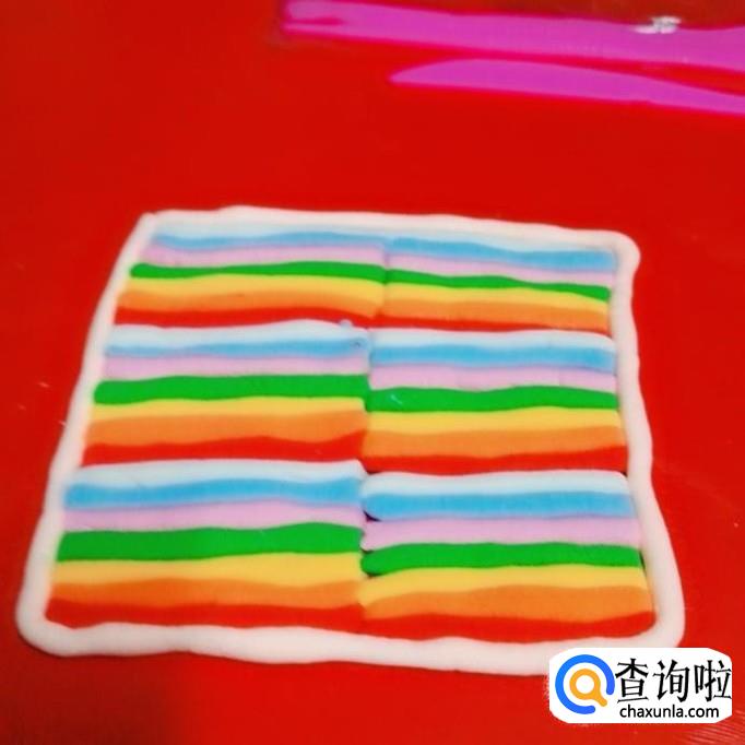 再用粉色超轻粘士,搓成一根长条,然后用地毯的外框,如图所示。