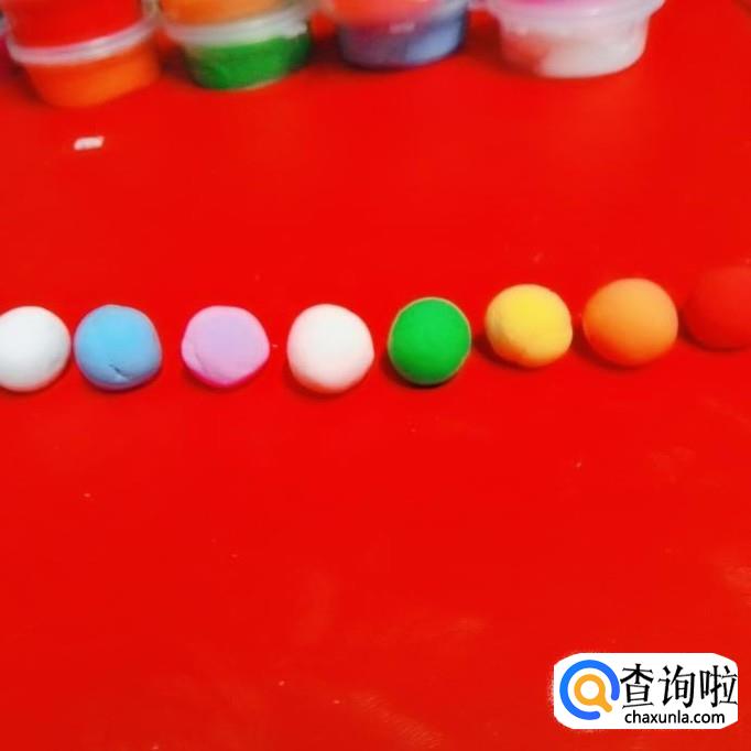 把8种颜色捏成八个大小差不多大的圆球,放在一起备用。如图所示。
