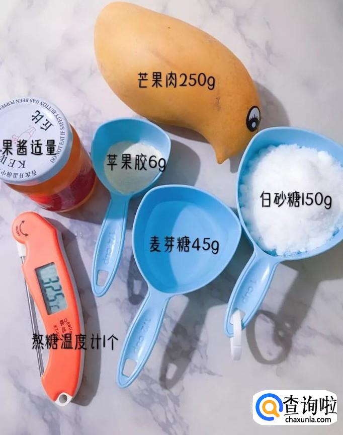 材料:果酱适量,苹果胶6克,麦芽糖45克,白砂糖150克,芒果250克,温度计一个。