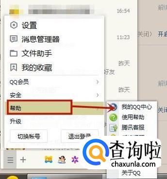 然后点击帮助中的我的QQ中心,如下图所示。哦!
