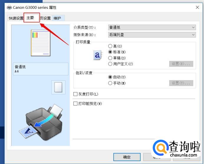 在弹出的属性页面中点击“主要”选项,进行页面设施,属性页面里的选项会因为软件版本的差异而不同,点击纸张/质量”选项也是一样。