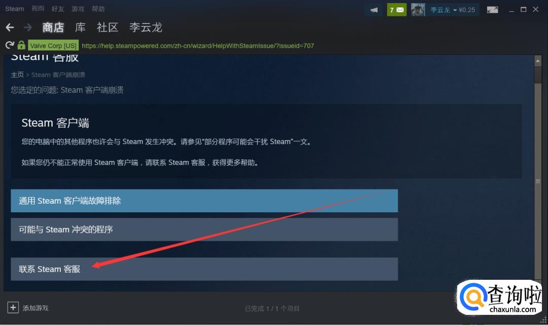 看到问题的下方,有联系STEAM客服,点击进去就可以跟人工客服反馈问题了。