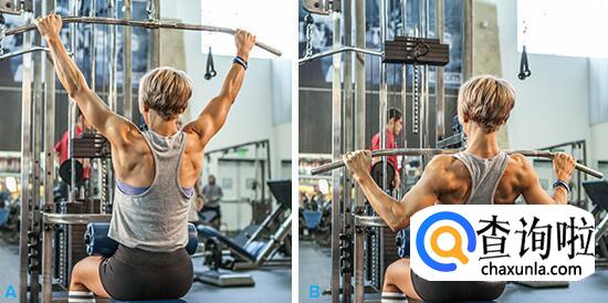 3.锁住肩胛骨。跟推胸一样,锁死肩胛骨可以减少你运用三角肌,稳定你的上背,更多的刺激背阔肌,锁住肩胛骨可为你的背部下拉带来截然不同的感觉。