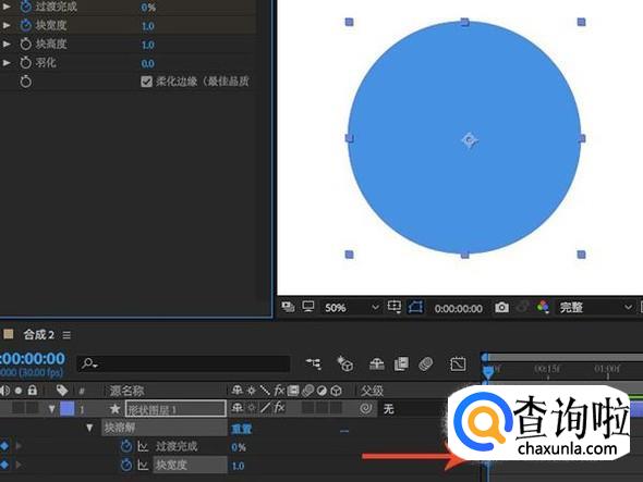 接着移动到位置,将过渡完成调整为100%,然后调整块高度以及宽度,这里调整之后就会自动打上关键帧。