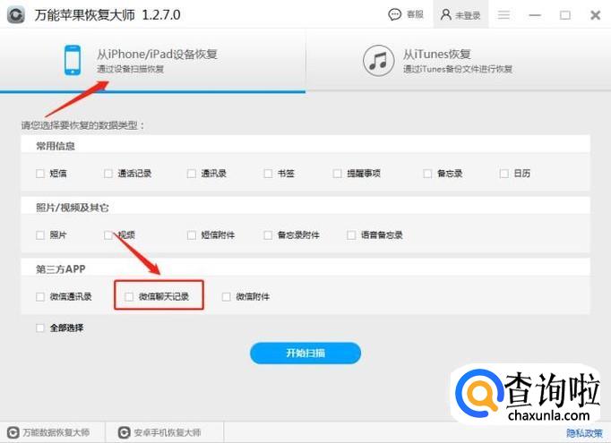 软件和手机连接成功后,会显示数据类型,接着选择从iPhone设备扫描恢复,再选择要的类型——微信聊天记录。