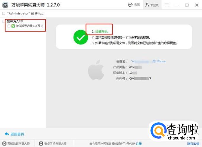 点击下一步,开始扫描手机上的数据,扫描的时候不要操作手机,并耐心等待扫描的结果,完成扫描后就可以点击进入查看数据。
