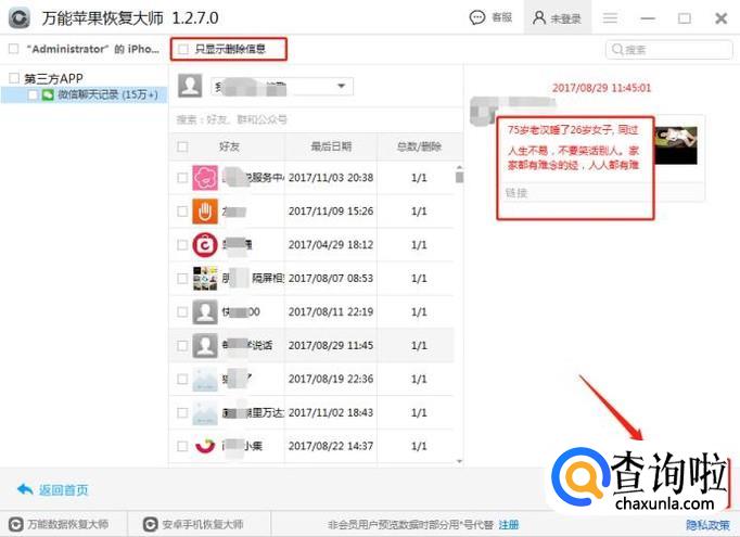最后从界面上找到已删除的聊天记录,然后选择后点击恢复按钮,就可以将聊天记录恢复了。