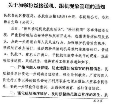 2018年7月,中国民用航空局下发《关于“加强粉丝接送机、跟机现象管理”的通知》,提到要加强管理,包括严格内部人员管理,防止泄露知名旅客的行程信息;强化机场秩序维护,及时预警防范聚众扰序的发生;保障航班运行安全,拒绝粉丝机上扰乱秩序行为。