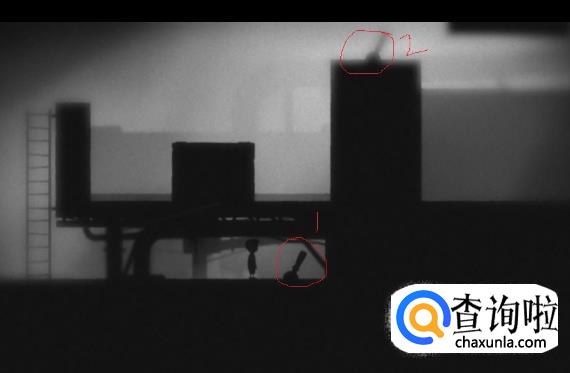 继续向右走,会遇到2个箱子(此处左边的箱子用箱子1代替,右边的箱子2代替),把箱子2推到最右边,然后把箱子1推到最左边爬上去,等待箱子2滑下来触发机关时,箱子1会飞上去落下来的时候立刻过去拉住,把箱子1拉到向上的梯子处。