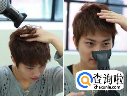 然后,我们用手一边按着发顶的头发,这样用手指轻轻按压,在吹,立体感就出来了。
