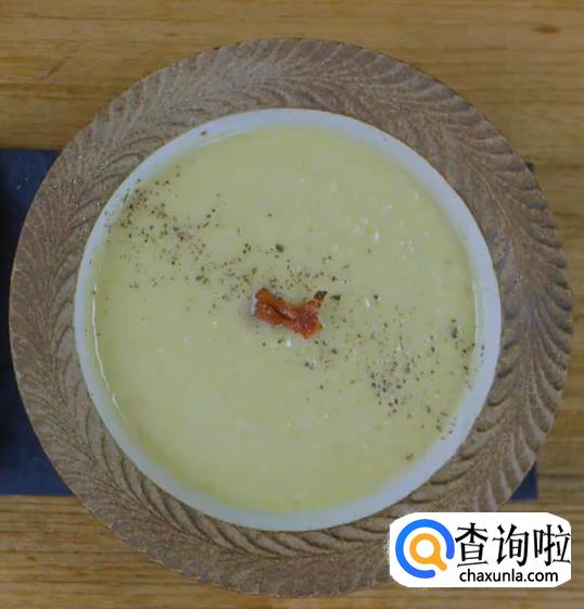 待白菜完全煮软,再倒入牛奶,加盐调味,用手持搅拌器打成泥就可以装盘了。装盘后用煎好的培根装饰,撒上黑胡椒就完成了。