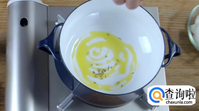 首先将白菜切块,在锅里倒入橄榄油和小茴香籽,小火加热。