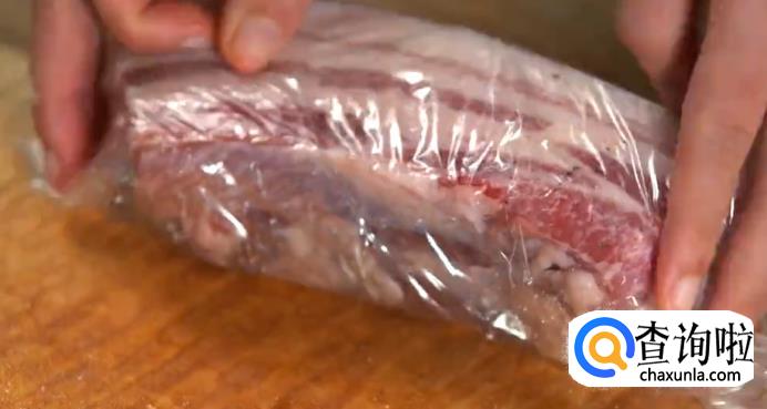 将猪肉均匀的抹上盐和黑胡椒,切适当大小,用保鲜膜包好,放入冰箱腌制两天。