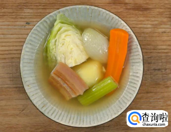 腌肉蔬菜浓汤:猪肉、盐、黑胡椒、芹菜、胡萝卜、洋葱、土豆、卷心菜、白葡萄酒、月桂叶、鸡汤粉、