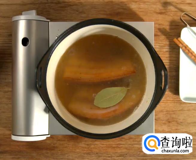 热锅起油,然后放入猪肉,倒入白葡萄酒,煎至表面金黄,沸腾后加水,月桂叶和鸡汤粉,盖上锅盖小火煮一个小时。