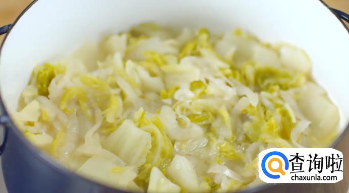 闻到香味后,转大火下洋葱快炒,洋葱炒软后,加入白菜及200克水,盖上锅盖用小火焖煮三四十分钟。