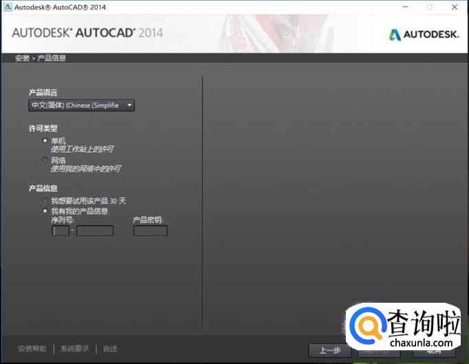 在安装前,我们需要设置软件的语言,以及是否联机,如果我们线下购买,点击脱机即可,如果线上购买,或者有Autodesk账号,也可选择网络。