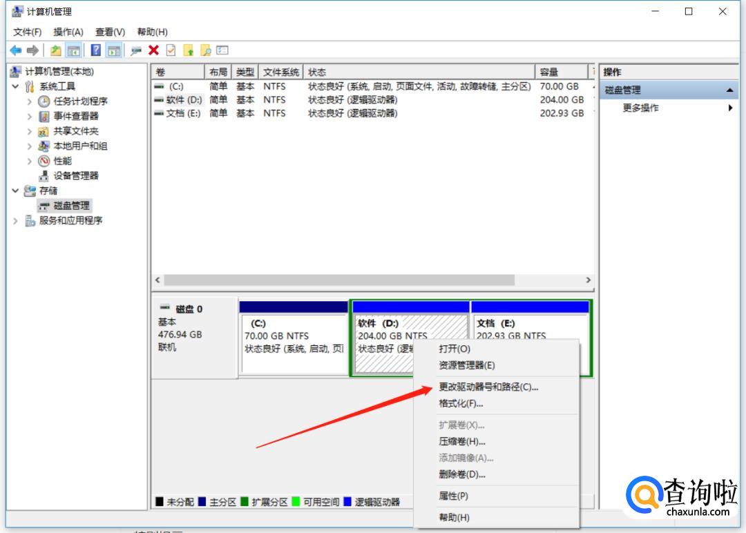在【软件D】和【文档E】两个钟选择一个点击右键选择【更改驱动器号和路径】。