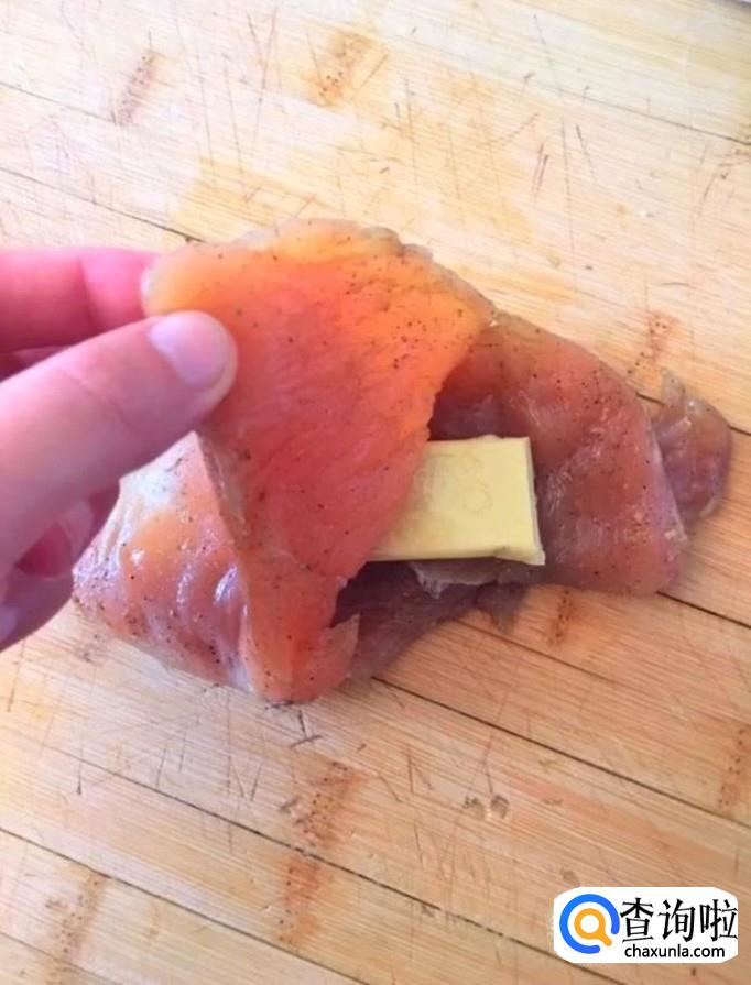 然后我们将准备好的乳酪塞入腌制好的鸡胸肉里面