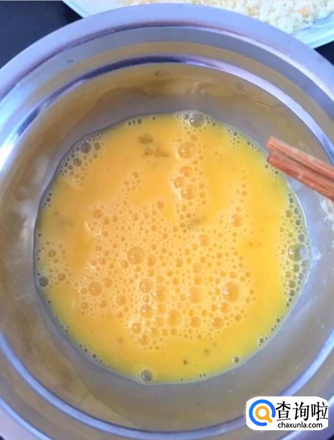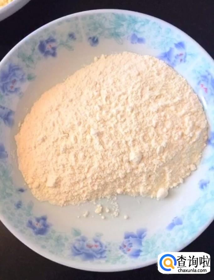 然后我们把一个鸡蛋打散放入盆中备用,准备一些面包糠,适量的低筋面粉