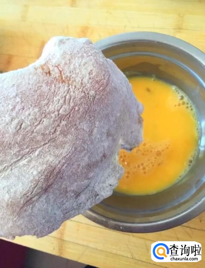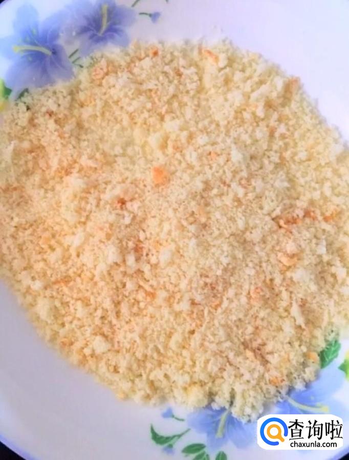接着我们先裹一层面粉,再裹一层鸡蛋液,最后裹一层面包糠,全部裹好备用