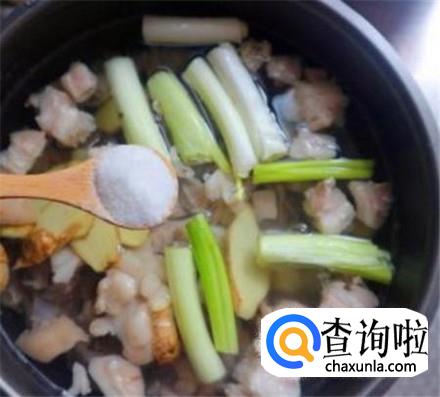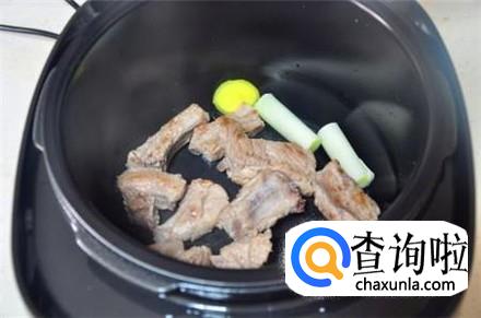 电压力锅里面加上生姜片和生葱,把排骨放进去。