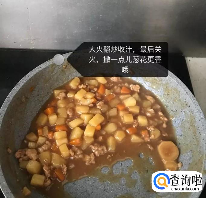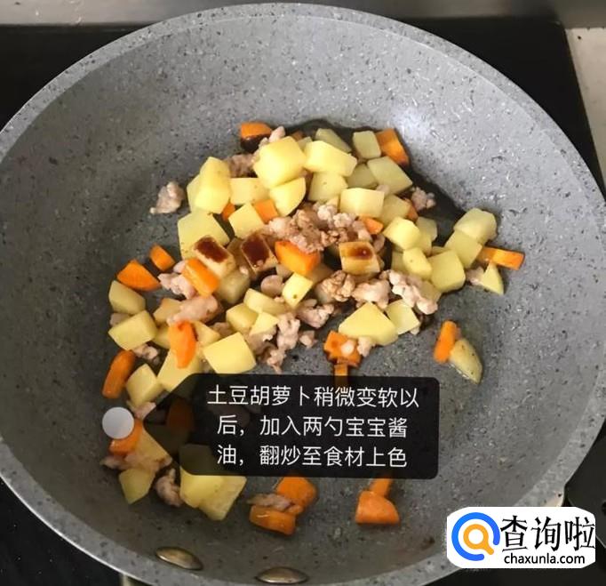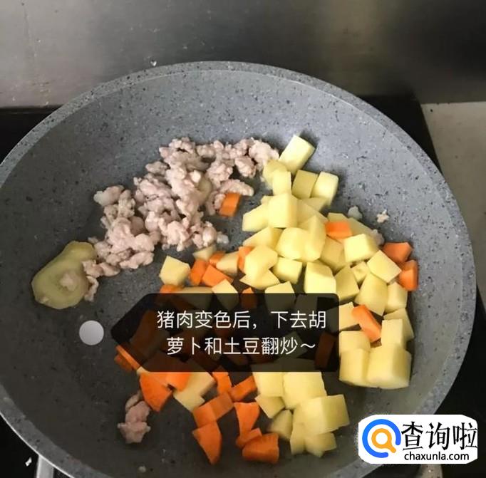 等到猪肉变色以后,下胡萝卜和土豆,翻炒三分钟,如下图所示。