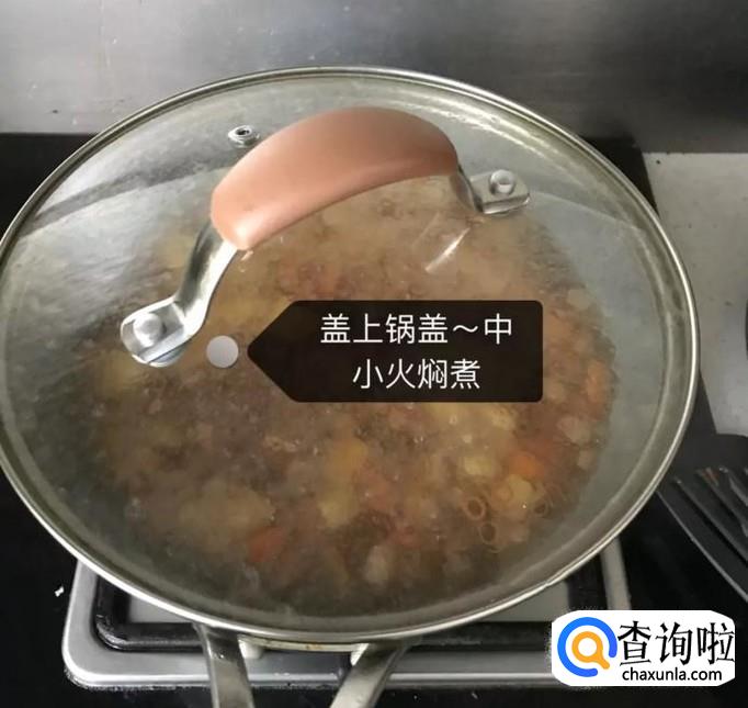 接着盖上锅盖,中小火闷煮15分钟,如下图所示。