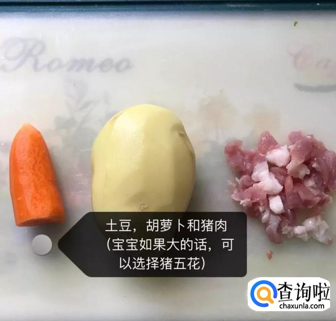 首先准备好要用到的土豆、胡萝卜和猪肉,如图所示。