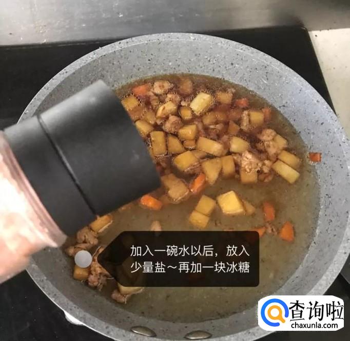然后往锅中加入一碗水,放入少量的盐和一块冰糖,如图所示。