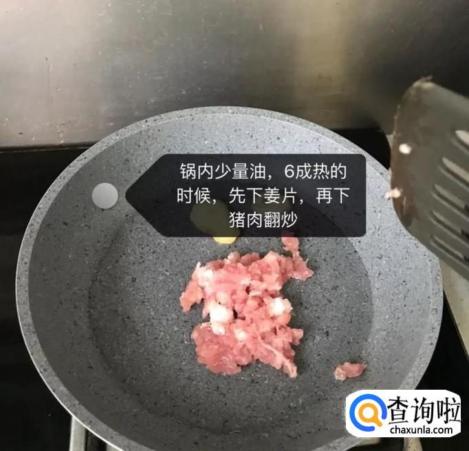 接着锅中放入适量的食用油,待油温六成热下姜片爆香,之后倒入猪肉翻炒三分钟,如下图所示。