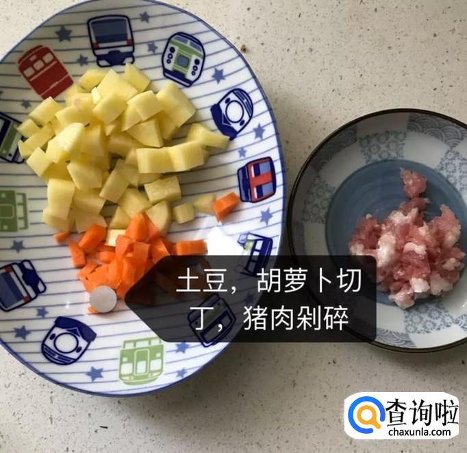 然后将土豆和胡萝卜切成丁,猪肉剁碎,如图所示。