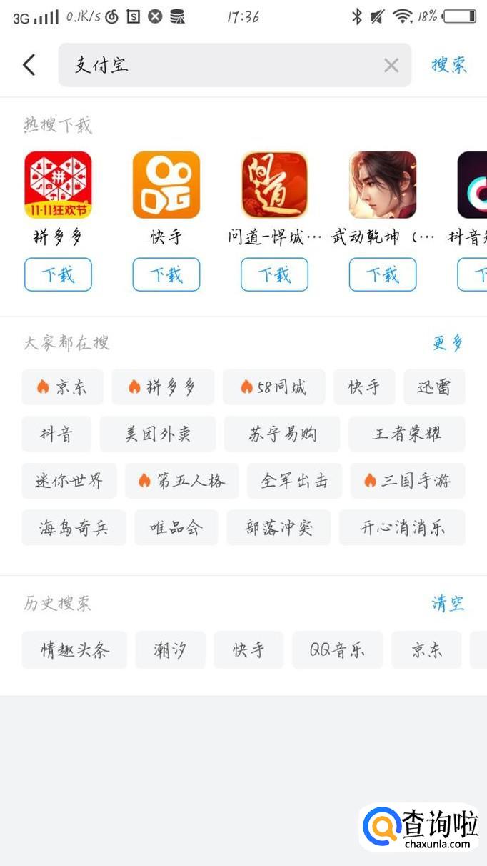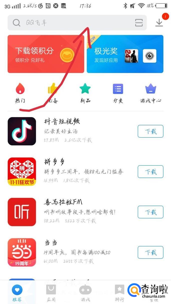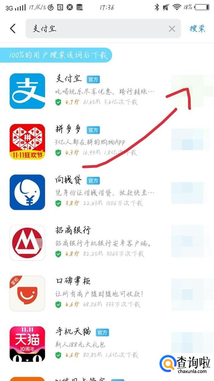 点击最上方的搜索框,如图1箭头所示。在搜索框中输入支付宝这几个字,如图2所示。