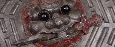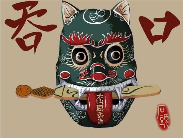 它是绘有狰狞怪兽的器物。怪兽绘太极八卦图,豹眼怒视,龇牙咧嘴,犬齿突出,血口洞开,好似能吞掉一切灾祸和妖魔鬼怪,保佑风调雨顺,避邪救灾免疫。怪兽形象或烧制成瓦当用作屋檐口,或雕刻于石柱立在道旁,或彩绘于木瓢背面悬挂于门楣之上。市内某些地方,也有请巫师(或称道士)手绘于纸的吞口(口中横含短剑),挂在门楣上边的。
