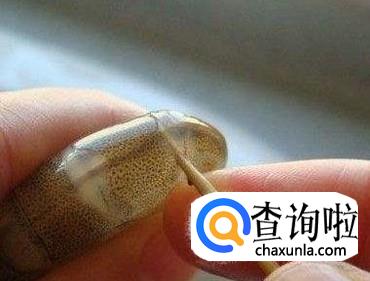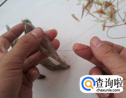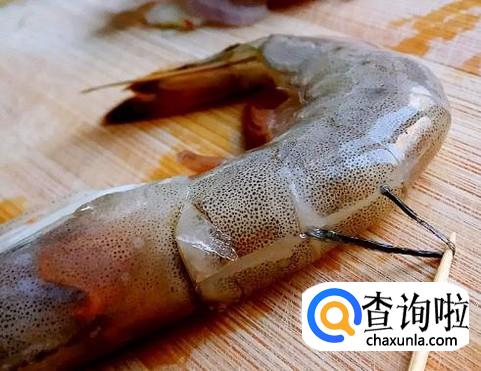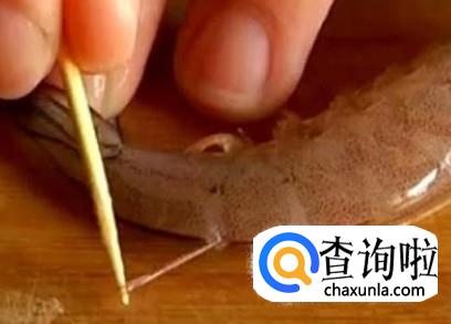 把虾弯一下,拿在左手中,这时就能看见虾背上的虾线,右手拿着牙签从虾尾上面两截处扎进去,一定要从虾线下面扎进去,这样才能把虾线挑出来。
