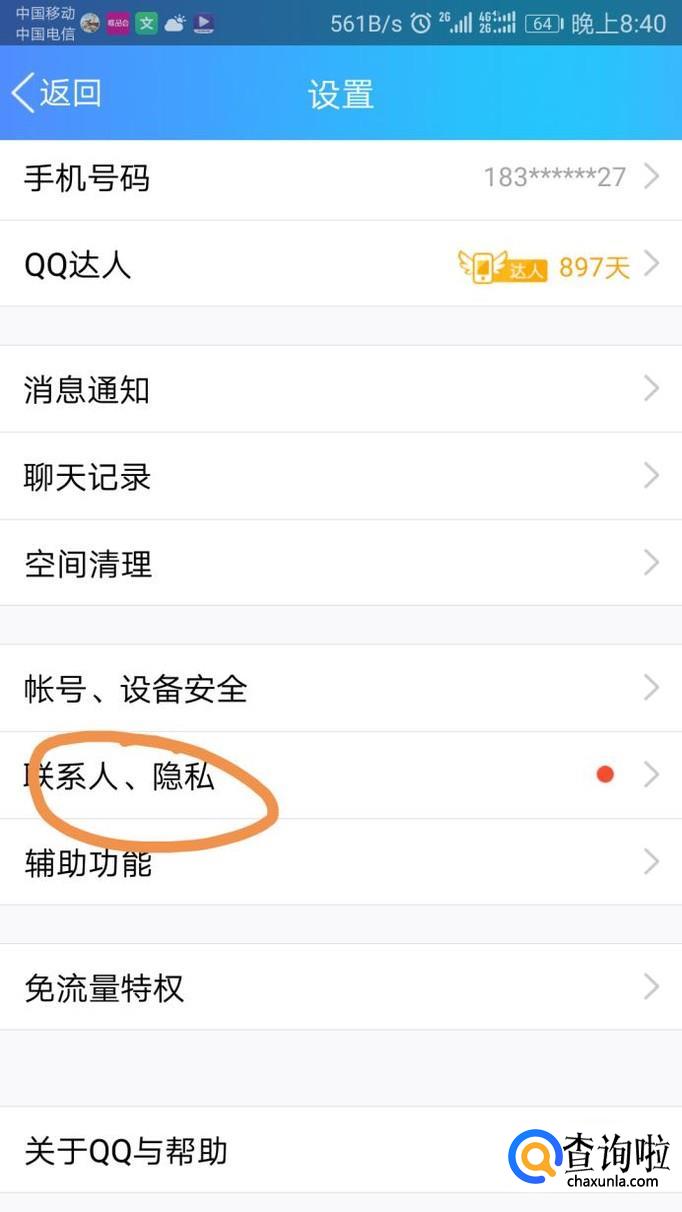 点击设置选项后,在新页面中选择联系人、隐私,点击确认