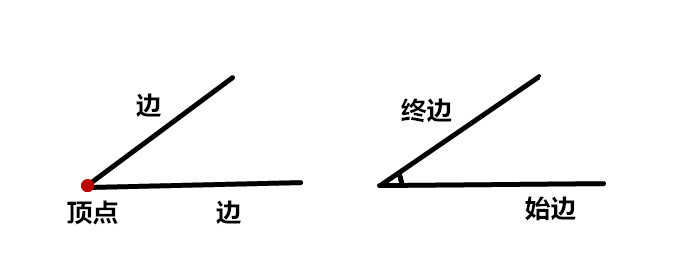 ①角的静态定义:具有公共端点的两条不重合的射线组成的图形叫做角(angle)。这个公共端点叫做角的顶点,这两条射线叫做角的两条边。 ②角的动态定义:一条射线绕着它的端点从一个位置旋转到另一个位置所形成的图形叫做角。所旋转射线的端点叫做角的顶点,开始位置的射线叫做角的始边,终止位置的射线叫做角的终边。
