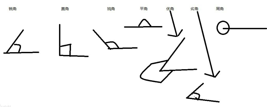 锐角(acute angle):大于0°,小于90°的角叫做锐角。 直角(right angle):等于90°的角叫做直角。 钝角(obtuse angle):大于90°而小于180°的角叫做钝角。 平角(flat angle):等于180°的角叫做平角。各个角度的描述 优角(reflex angle):大于180°小于360°叫优角。 劣角(Inferior angle):大于0°小于180°叫做劣角,锐角、直角、钝角都是劣角。 角周角(round angle):等于360°的角叫做周角。 负角(negative angle):按照顺时针方向旋转而成的角叫做负角。 正角(positive angle):逆时针旋转的角为正角。 零角(zero angle):等于0°的角。