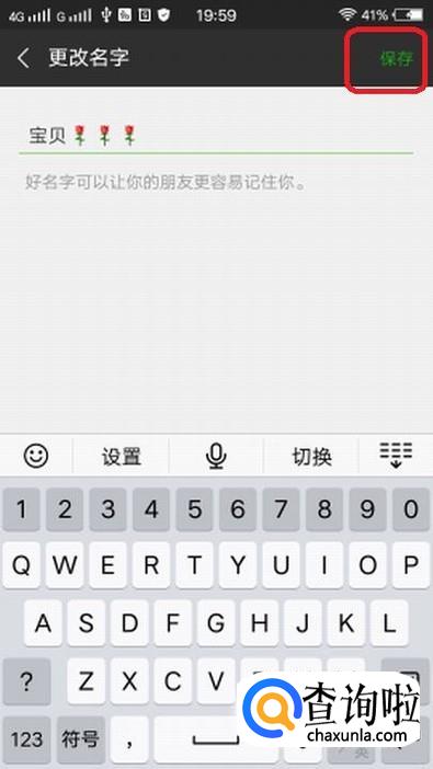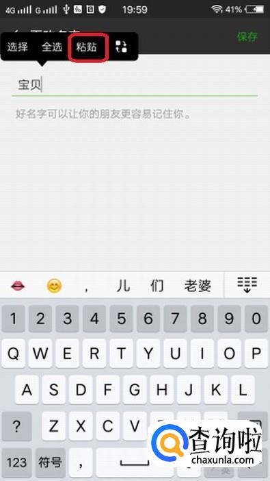 然后我们关闭聊天窗口,点击自己的昵称,长按空白处,会弹出选项,我们选择“粘贴”,效果如下图,然后点击“保存”。