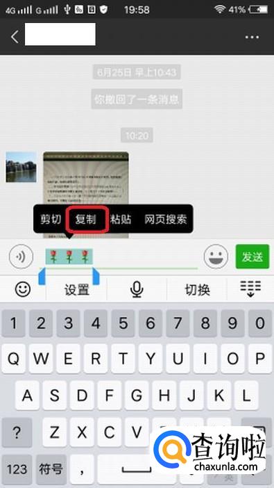 找到喜欢的表情后,我们输入在对话栏里,然后长按选择“全选”,“复制”。
