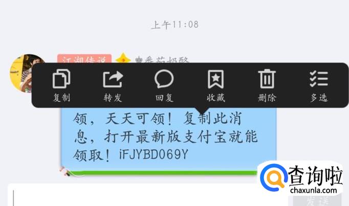 来到QQ,找到一个人比较多的群,在消息框里点击粘贴,你的吱口令就可以发送出去了。只要别人复制了你的吱口令,发开支付宝就可以领取你的红包了。