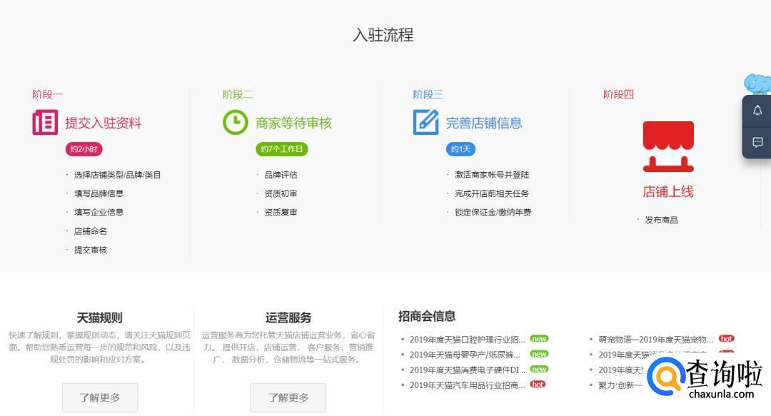 在【招商首页】,点击【入驻要求】,跳出页面可以看到各种类目下的不同类型店铺目前是否仍在招商。