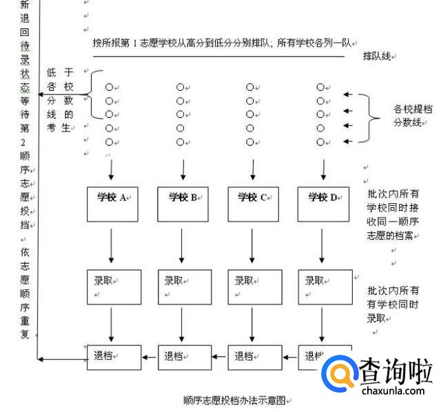 进行志愿填报时,应该按照往年院校的录取分数线的高低进行排序。这是顺序志愿投档图。希望可以帮助到你。