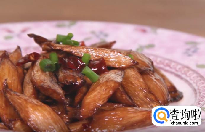 5分钟之后,将茭白夹出装盘,再将干辣椒撒在茭白上,另外放上适量葱花,这道油焖茭白就完成了。