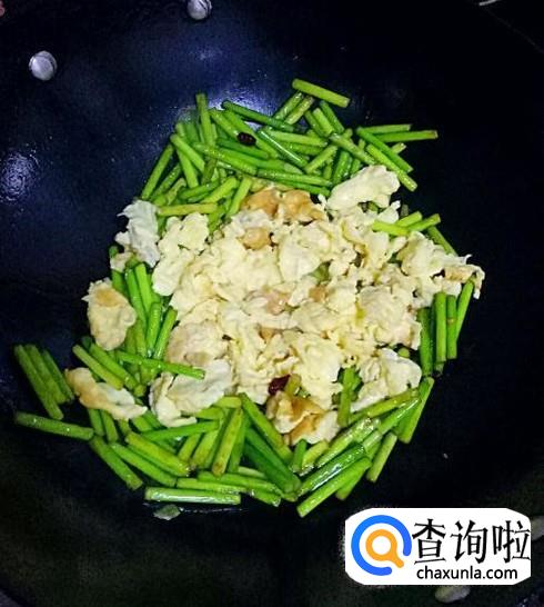 锅烧热,再加入适量的植物油,油烧热,倒入切好的蒜苔。加入适量的食用盐,大火翻炒至五成熟左右,将碗中的鸡蛋块倒入。转为小火,继续翻炒。
