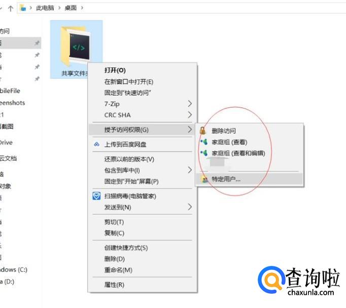 鼠标右键该文件夹,在弹出的选项中选择授予访问权限,在展开的列表中可以看到分享的选项,分为家庭组和特定用户