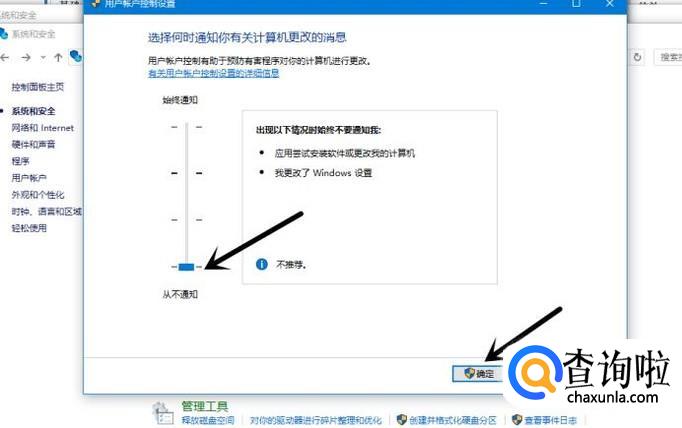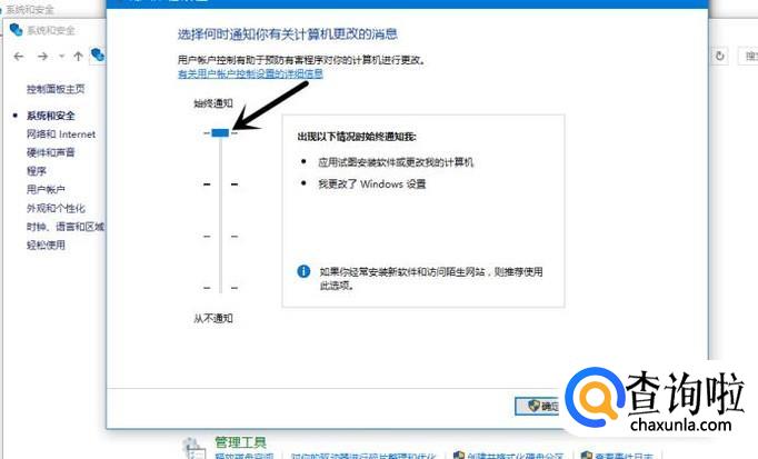 将如图按钮往下拉,把 始终通知 改为 从不通知,最后点击确定就可以了。以后你在使用电脑的过程中就不会在无缘无故提醒“本次操作由于这台计算机的限制而被取消”的窗口了,